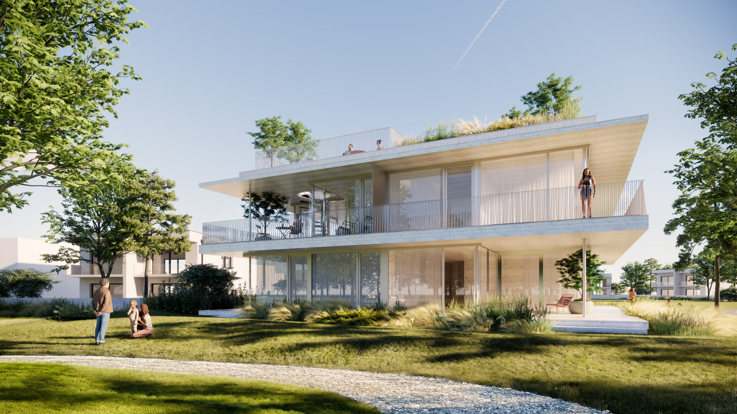 Výstavba prebieha kompletne na kľúč – od architektúry cez interiérové riešenia až po dokončené exteriéry. V cene je zahrnuté kompletné zariadenie interiéru a úprava vonkajších priestorov vrátane terás a záhrad.